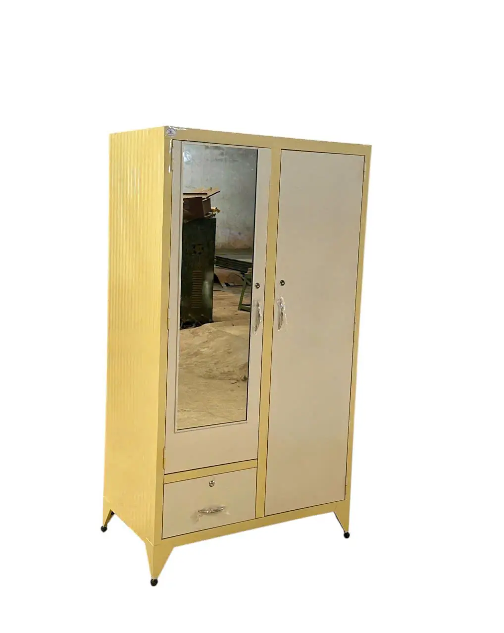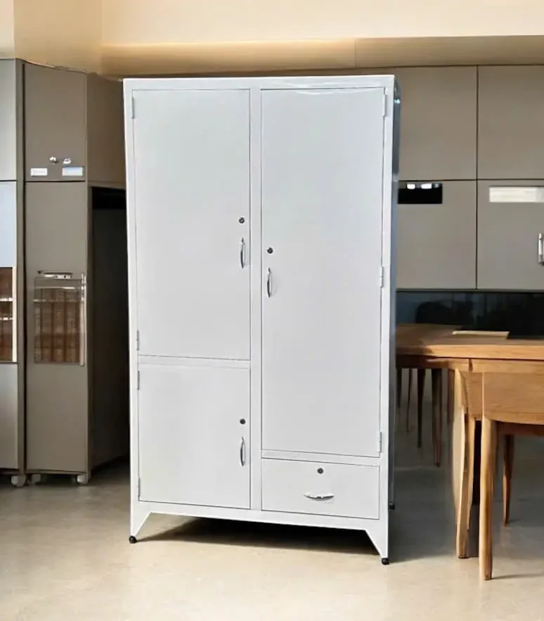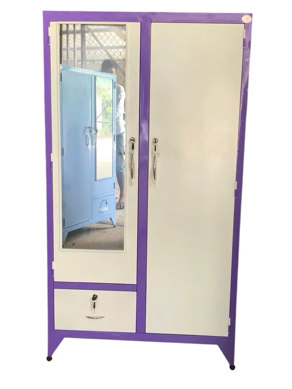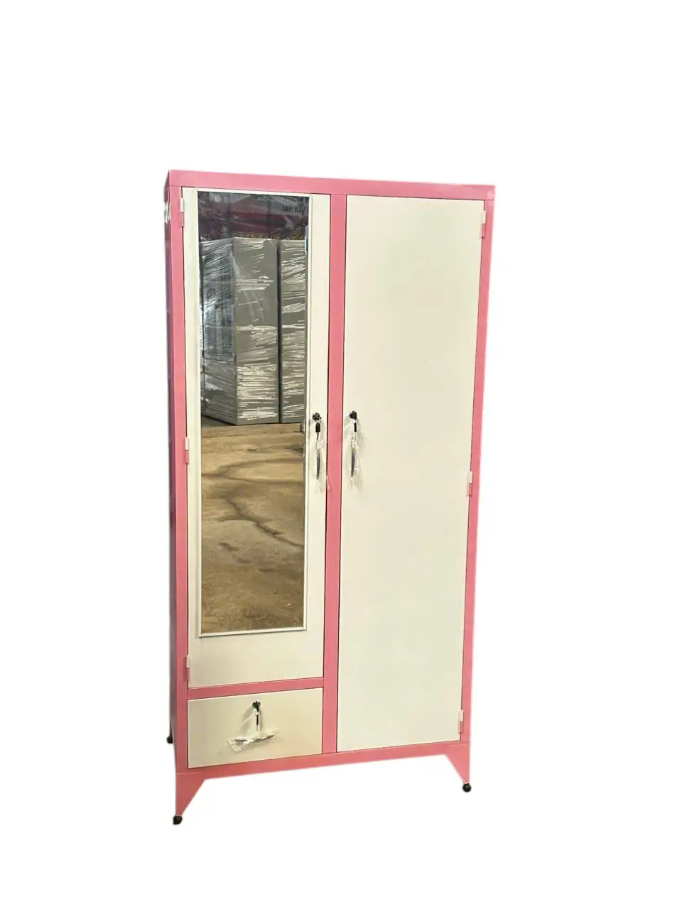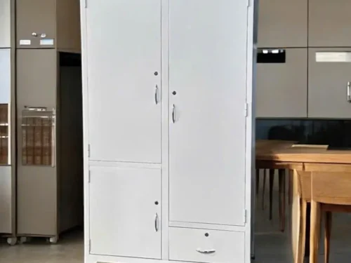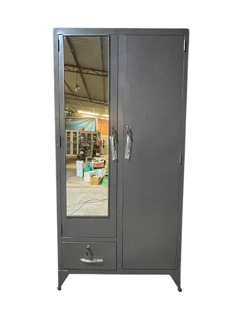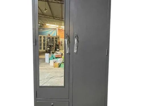 Chiếc tủ sắt treo áo này, với thiết kế 2 cánh 2 khoang, khoang bên trái có 1 cánh mở bên trong có 2 đợt chia thành 3 ngăn, phía dưới có 1 ngăn kéo bên ngoài, khoang bên phải có 1 thanh treo áo, phía dưới có 1 hộc kéo nhỏ phía trong, thực sự là một giải pháp lưu trữ đa năng và thông minh.