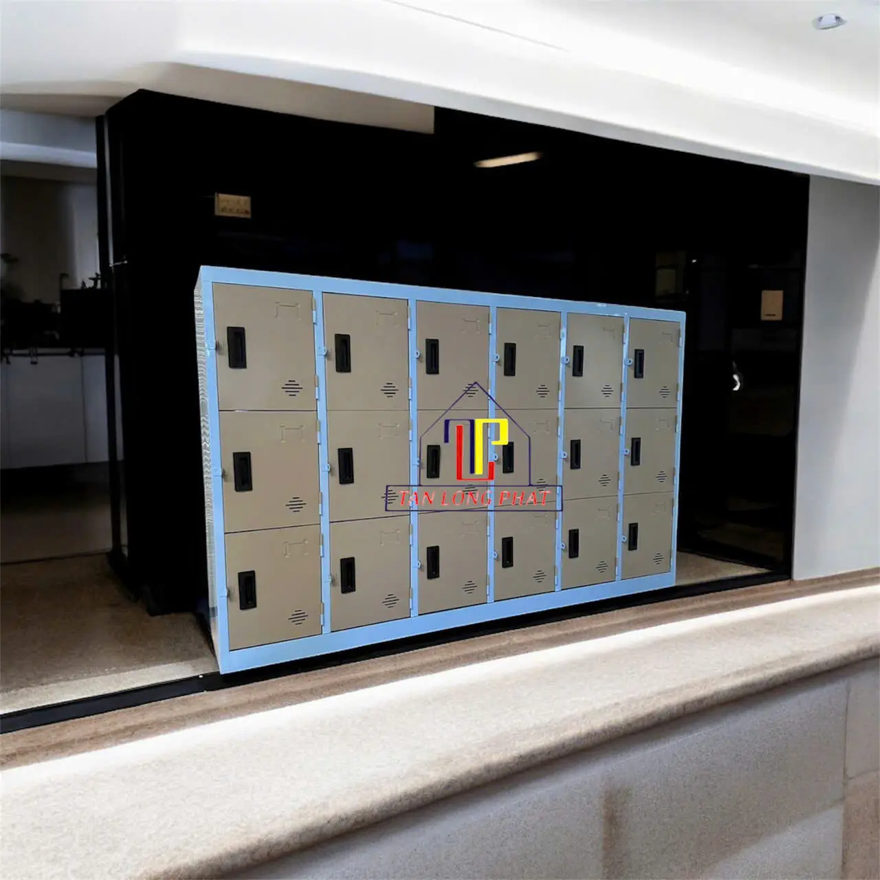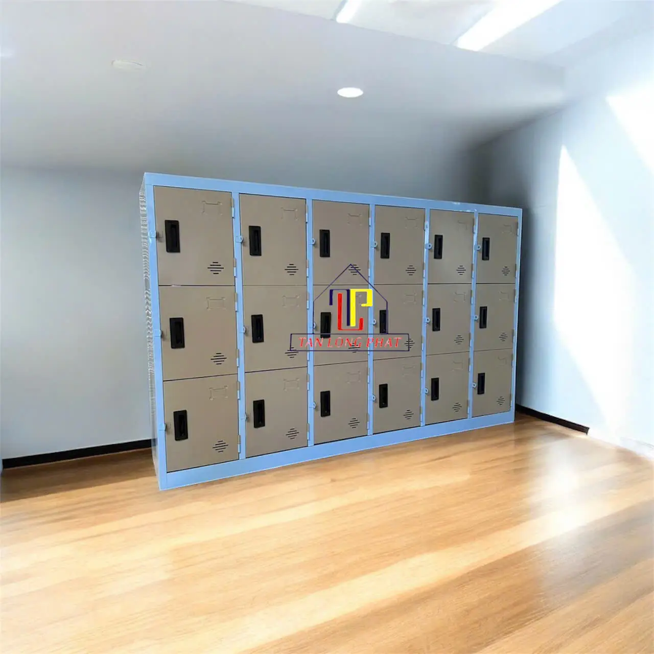 Tủ trường học 18 ngăn sơn tĩnh điện bền đẹp. Trên mỗi cánh tủ có tay nắm âm, bảng tên, lỗ thông gió và tay móc khóa.